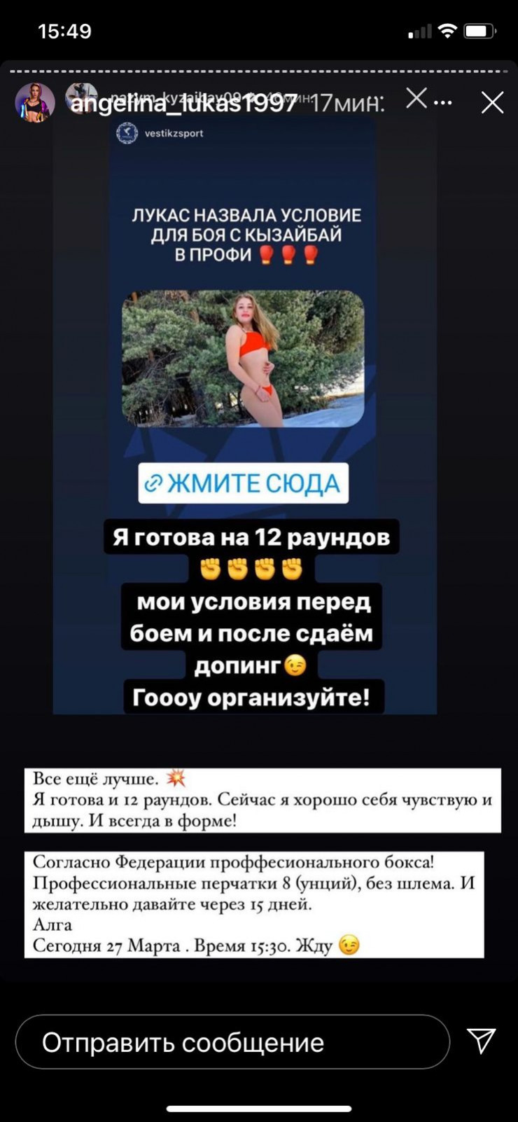 Ответ Ангелины не заставил себя ждать: "Я все еще лучше. Я готова и 12 раундов. Сейчас я хорошо себя чувствую и дышу. И всегда в форме! Согласно Федерации профессионального бокса! Профессиональные перчатки (8 унций), без шлема. И желательно давайте через 15 дней. Алга. Сегодня 27 марта. Время 15:30. Жду", - написала Лукас на своей странице в Instagram.