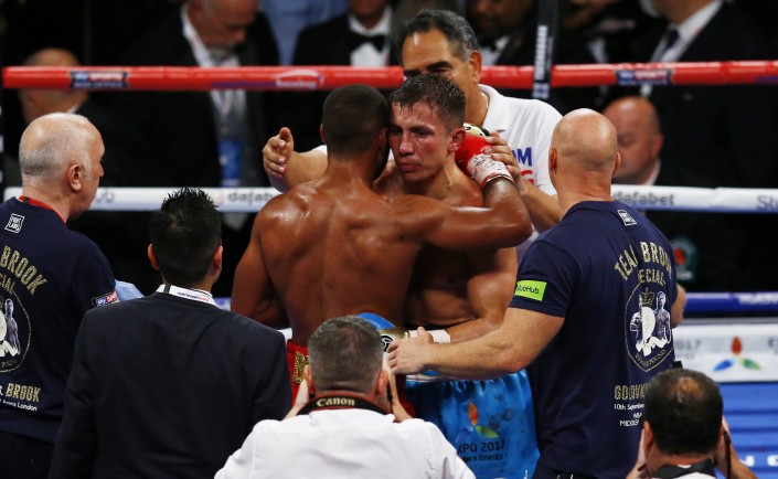 Чемпион мира по версиям WBA (Super), IBO, IBF и WBC в среднем весе казахстанец Геннадий Головкин (35-0, 32 КО) досрочно в пятом раунде победил обладателя пояса IBF в полусреднем весе британца Келла Брука (36-0, 25 КО), сообщают Vesti.kz. Поединок проходил на 20-тысячной арене О2 в Лондоне.