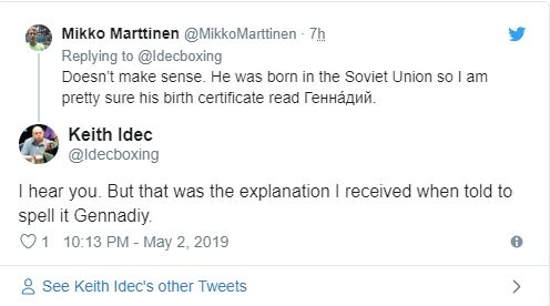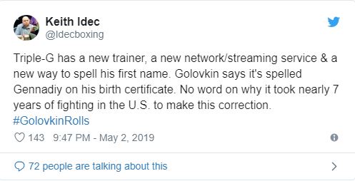 "У GGG сейчас есть новый тренер, новая сеть/стриминговый сервис и новое произношение его имени. Головкин сказал, что в свидетельстве о рождении он - Геннадий (Gennadiy). Ни слова о том, зачем нужно исправлять это после семи лет выступлений в США", - написал Айдек.