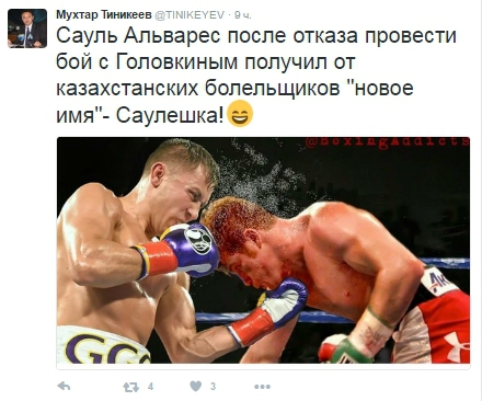 "Сауль Альварес после отказа провести бой с Головкиным получил от казахстанских болельщиков новое имя - Саулешка!" - написал депутат Парламента.