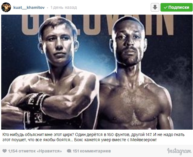 В свою очередь, казахстанский боец смешанных единоборств Куат "Найман" Хамитов на своей странице в Instagram назвал все происходящее "цирком". "Кто-нибудь объяснит мне этот цирк? Один дерется в 160 фунтах, другой в 147. И не надо гнать, что все якобы боятся... Бокс, кажется, умер вместе с Мейвезером!" - написал он.