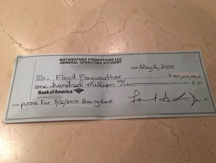 Знаменитый американский боксер Флойд Мейвезер-младший, который до завершения карьеры считался лучшим боксером мира вне зависимости от весовой категории, опубликовал на своей странице в Instagram фотографию чека на 100 миллионов долларов.