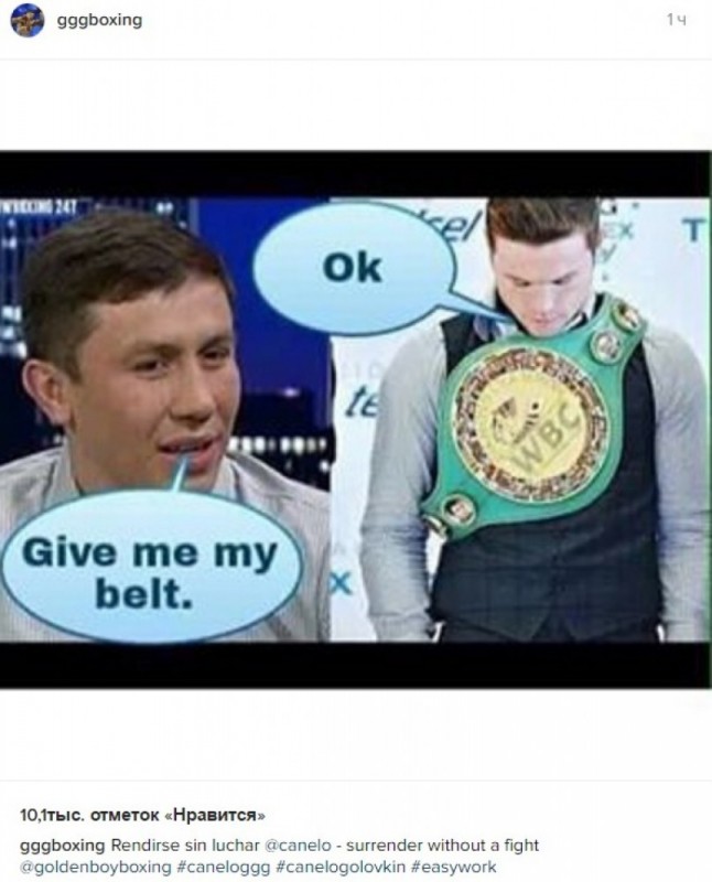 Непобежденный казахстанский боксер Геннадий Головкин на своей странице в Instagram потроллил мексиканца Сауля "Канело" Альвареса, который накануне отказался от пояса чемпиона WBC, после чего данный титул без боя перешел к Головкину.