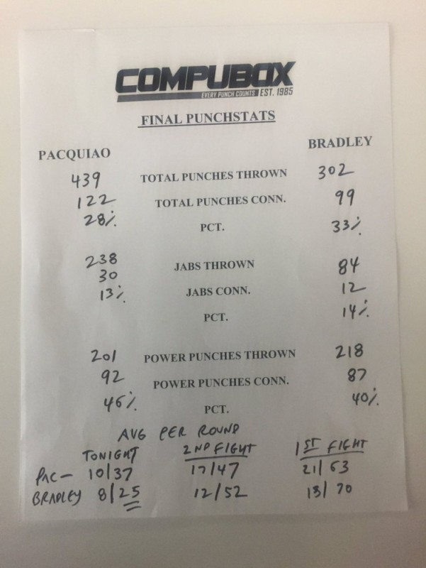 Согласно статистике ударов боя, Пакьяо выбросил 439 ударов (122 достигли своей цели), Брэдли выполнил на сто ударов меньше - 302 (99 достигли цели).
