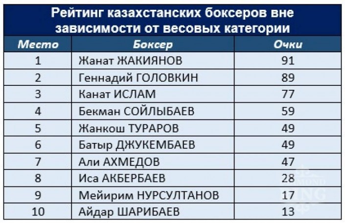 Как сообщает спортивный портал Vesti.kz, перед боем с британцем Жанат Жакиянов возглавил первый в своем роде рейтинг казахстанских боксеров-профессионалов вне зависимости от весовых категорий, составленный официальным сайтом промоутерской компании Diamond Ring.