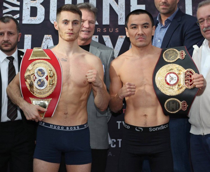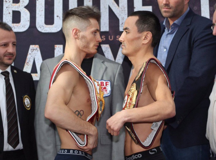 Казахстанский боксер Жанат Жакиянов, владеющий титулом чемпиона мира по версии WBA в легчайшем весе, и чемпион IBF ирландец Райан Барнетт провели официальное взвешивание и последнюю дуэль взглядов перед объединительным боем.