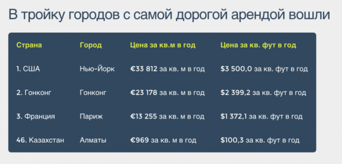 В этот список вошли улицы Гоголя, Фурманова и Кабанбай батыра. Все три названные улицы входят в "золотой квадрат" южной столицы. Отмечается, что в 2013 году эти улицы находились на 40-й строчке рейтинга, а сейчас заняли 46-ю позицию. Соседями Казахстана по арендной ставке торговых площадей стали Колумбия (45 место) и Катар (47 место).