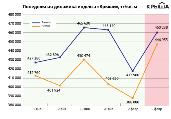 До того, как был введен запрет на цены в долларах, в Астане, к примеру, квадратный метр в среднем стоил 388 тысяч тенге (при курсе 360 тенге это равнялось 1078 долларам). Теперь стоимость квадратного метра составляет 447 тысяч тенге. Прирост составил 59 тысяч тенге, или 15,2 процента за неделю. Аналогичная ситуация наблюдается и в Алматы, где прирост равняется 10,1 процента.