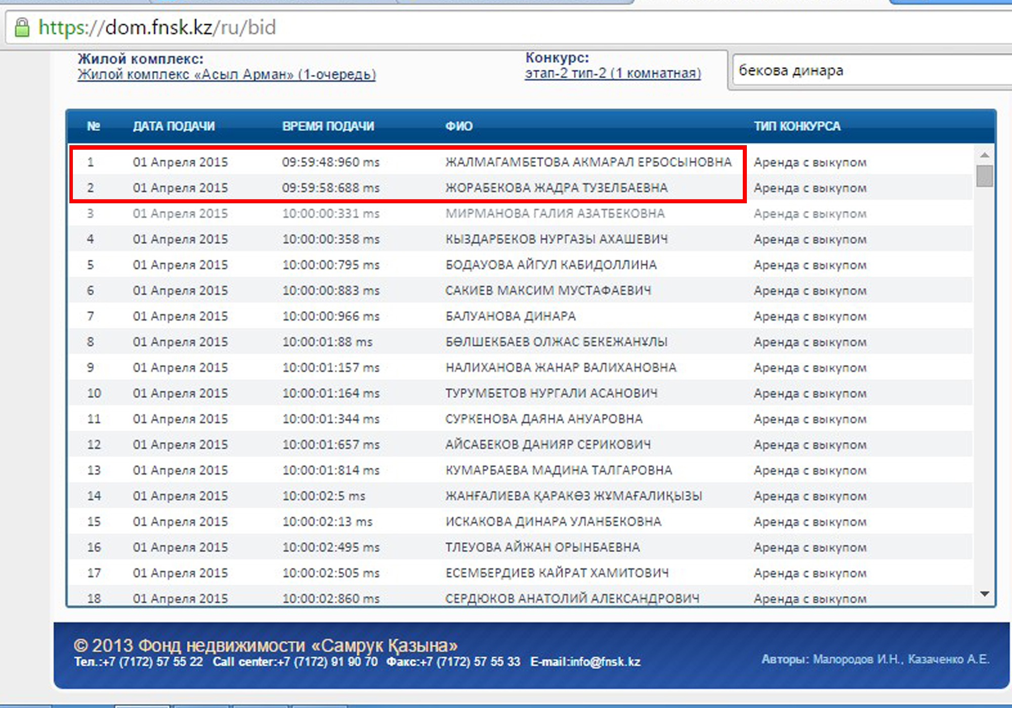 "Было официально объявлено о том, что 1 апреля ровно в 10.00 начнется регистрация на сайте. Я в первую же секунду нажал на кнопку и зарегистрировался, однако непонятным образом оказался две тысячи семисотым в списке, а на сайте я увидел, что регистрацию проходили и в 9.59, что противоречит правилам. Я засомневался, - рассказывает один из претендентов на арендное жилье житель Алматы Бауыржан Усенов. - Система перестала работать, и немного позже мне пришло сообщение о том, что все заявки аннулированы. К тому же это не первый раз - до этого я еще пытался зарегистрироваться, но также заявка была аннулирована".
