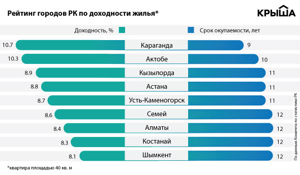 В Актобе срок окупаемости равен 10 годам. Квартира в главном городе Актюбинской области способна приносить доход 10,3 процента годовых. В Кызылорде вложение в недвижимость полностью оправдается через 11 лет при доходности 8, 9 процента.
