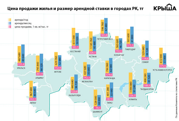 В Алматы при средней стоимости однокомнатной квартиры в 13 миллионов тенге и арендной ставке более 91 тысячи в месяц инвестиция окупится через 12 лет. Процент доходности - 8,4 процента. Приблизительно такие же показатели у недвижимости в Шымкенте, Костанае, Семее.