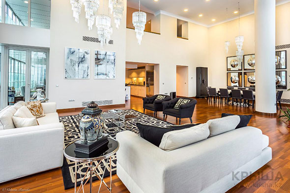 Самым дорогим предложением в рейтинге стал двухуровневый пентхаус на 12-м этаже в 18-этажном ЖК Esentai Apartments. В квартире площадью 540 квадратных метров шесть комнат, несколько санузлов, балконов и лоджий, витражные окна, дизайнерский интерьер и мебель. Проживание в таких апартаментах обойдется в 4,2 миллиона тенге в месяц.