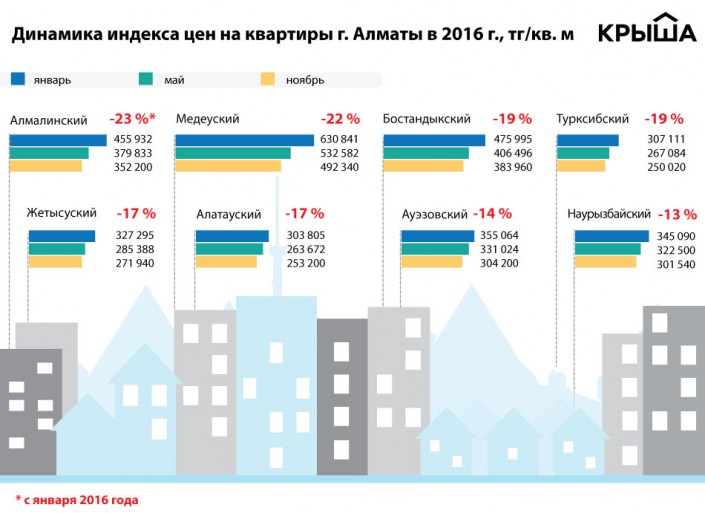 Портал Krisha.kz проанализировал данные за 11 месяцев 2016 года и выяснил, какие районы города лидировали по темпам снижения цен, а какие менее охотно адаптировались к сложной ситуации на рынке.