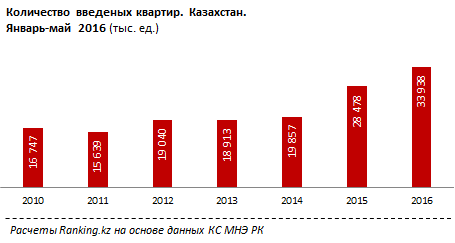 "При этом, как и годом ранее, столица продолжает удерживать лидирующие позиции по вводу зданий в эксплуатацию (за январь-май 2016 года). Было введено более 900 тысяч квадратных метров жилья. Второе место занимает Алматы (введено более 700 тысяч квадратных метров.), также высоки доли Алматинской области и Мангыстау. Всего в Казахстане с января по май было введено почти 4 миллиона квадратных метров жилья, что на 20 процентов больше, по сравнению с аналогичным периодом прошлого года. Количество введенных квартир составило 33 938, из них индивидуальными застройщиками 13 682 единицы", - говорится в распространенном сообщении.
