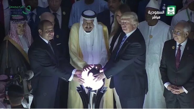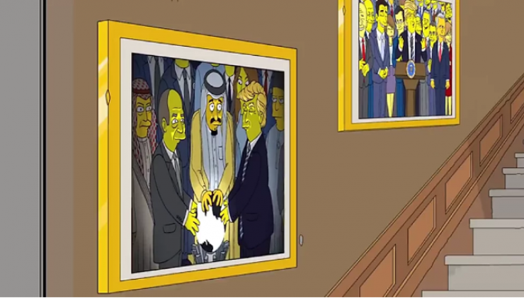 Симпсондар Трампты президент етіп қана қоймай, оның Мысыр және Сауд Арабиясы президенттерімен одақ құрмақ болғаны туралы да "болжаған". Ал шын мәнінде Желіде бірінші суреттің түпнұсқасы, кейіннен Fox-тың каналында қысқаша ролик жарияланған.