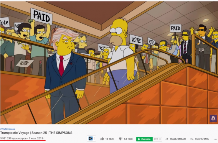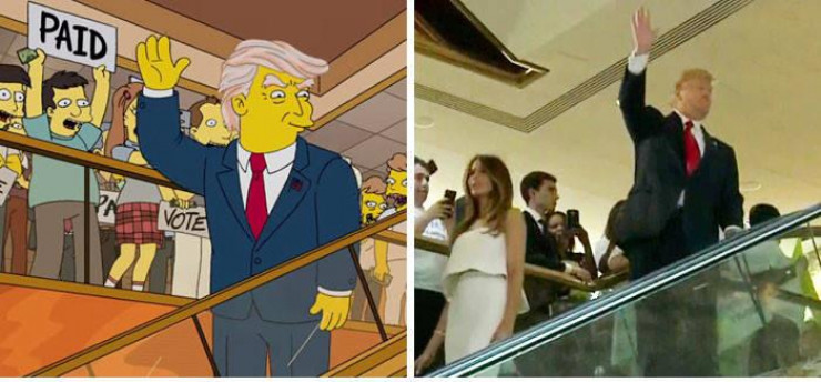 Расында осы скриннен кейін Симпсондар алда не болатынын дәл болжады деген ой қалыптасқан. Алайда кейіннен Трамп әйелімен эскалаторда түсіп келе жатқан видеосы Желіде мультфильмнен бұрын пайда болғаны анықталған.