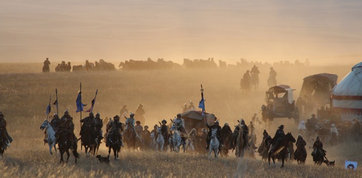 Напомним, что съемки картины стартовали 7 сентября 2015 года и велись на протяжении пяти месяцев на более чем 30 объектах в Алматы и Алматинской области. Часть из них проходила в декорациях, построенных специально для проекта на территории студии "Казахфильм", где художники воссоздали дворец Шайбаншаха. Подробнее о том, как проходили съемки фильма, можно прочитать здесь и здесь.