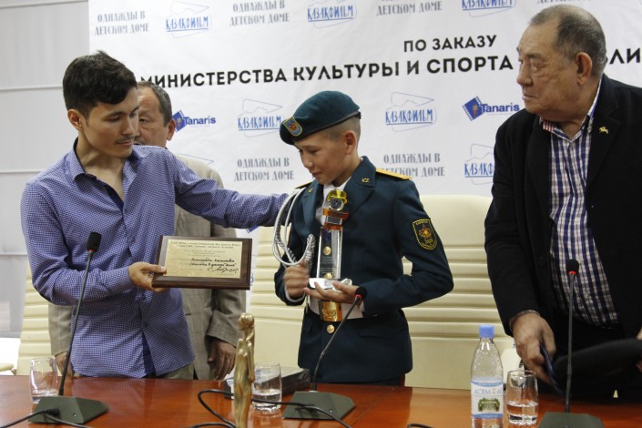 Серик Абишев вручает награду юному актеру. Фото Tengrinews.kz