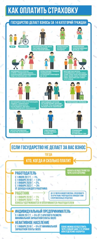 Кроме того, с 1 января 2018 года появляется обязанность уплаты взносов еще и всем остальным легально проживающим на территории РК гражданам, а также постоянно проживающим иностранным гражданам и лицам без гражданства. Все эти люди должны уплачивать ставки по соответствующим категориям, если они не относятся ни к одной из перечисленных мною ранее групп, то они должны самостоятельно перечислять взносы за себя в фонд социального медстрахования. Ставка взноса для них установлена в размере 5 процентов от минимальной заработной платы ежемесячно.