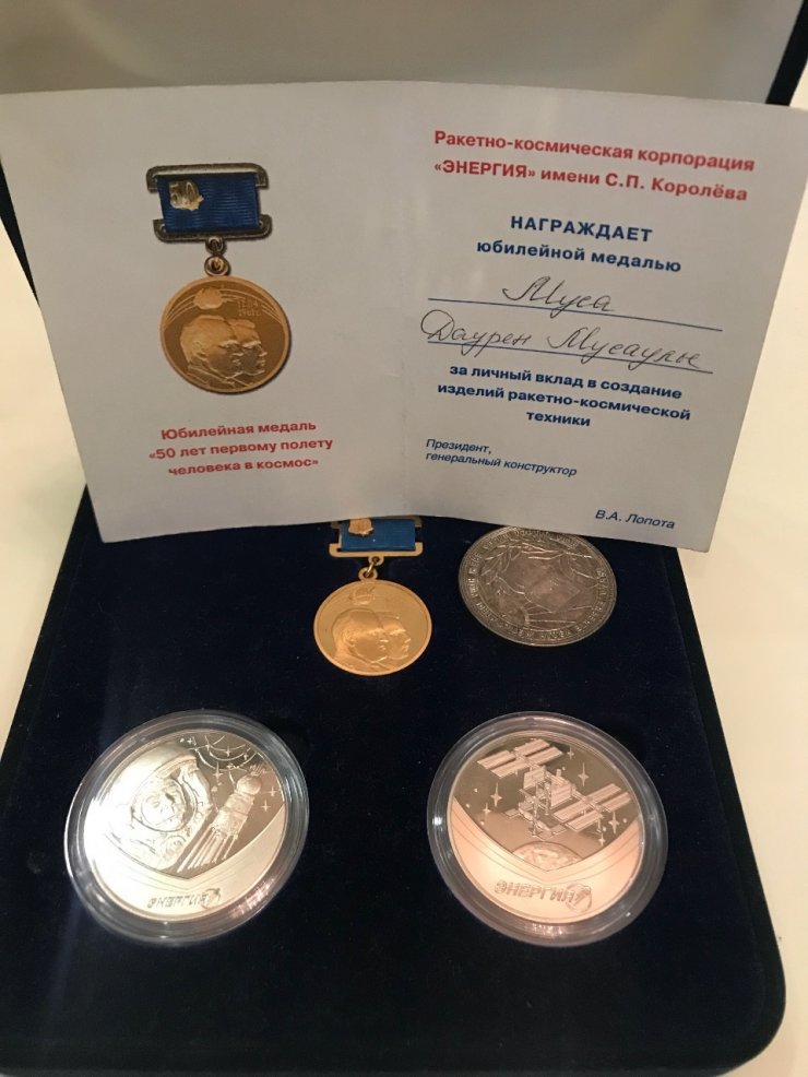 Мы единственные в Казахстане, кто награжден юбилейной медалью от Ракетно-космической корпорации "Энергия" имени Королева, за личный вклад в создание изделий ракетно-космической техники. Это юбилейная медаль "50 лет первому полету человека в космос".