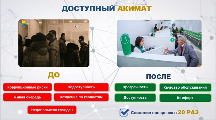 Также для комфортной среды городского населения запущен проект "Доступный акимат". Это принцип открытой площадки позволил исключить коррупционные риски и повысить качество предоставления услуг. К примеру, здесь запущен проект по автоматизации услуги "Согласование акта выбора земельного участка". Ранее на согласование уходило два-три месяца. Теперь этот процесс занимает от пяти до 12 дней. В итоге это привело к сокращению количества оказанных услуг с нарушением срока в 20 раз.