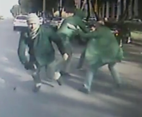 Двое из них пытаются выхватить у своих оппонентов предмет, похожий на сумку. При этом мужчина в черной куртке размахивает предметом, похожим на оружие. В итоге двое нападавших убегают, пробегая прямо перед транспортом с камерой.