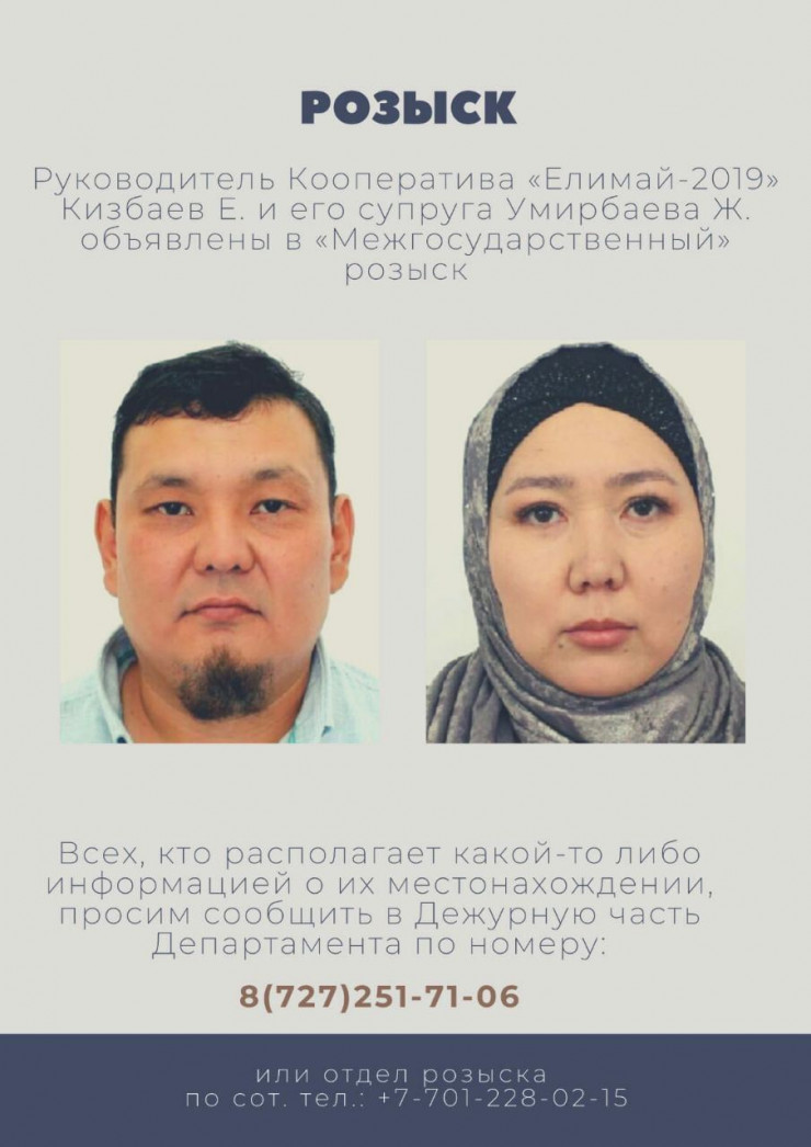 "Руководитель кооператива "Елимай-2019" Ербол Кизбаев и его супруга Жазира Умирбаева объявлены в межгосударственный розыск", - добавили в АФМ.