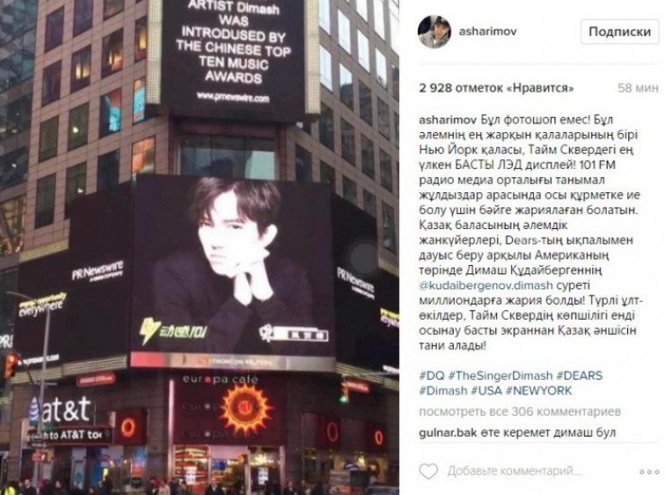 Тағы Нью Йорктегі Тайм Сквердегі лэд экранда Димаштың суреті шықты. Бірнеше миллион адам көрді. Бұл экранға шығу үшін жанкүйерлердің даусы керек. Көпшіліктің көңілін аулаған әнші әлемнің үздік экранынан бір-ақ көрінді. Бұл да - Қазақстан туризмі үшін "тегін жарнама".