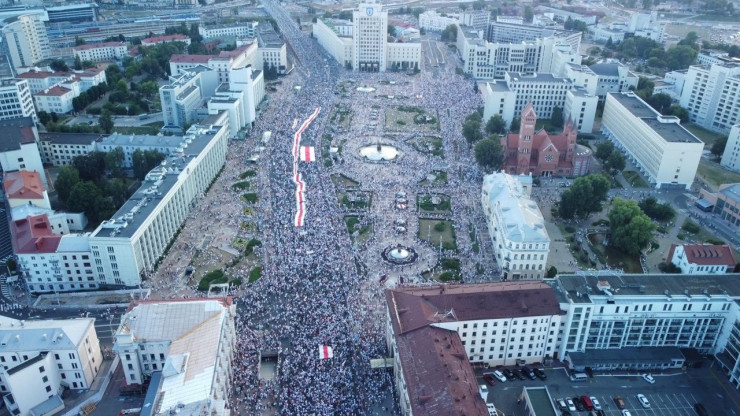 После этого Михалков показал фотографию пустой площади Независимости в Минске "в мирное время", на которой отчетливо видны два фонтана. За ней последовал снимок все той же площади с толпой людей во время протестов. На фотографии при этом стоит логотип оппозиционного телеграм-канала Nexta, освещающего события в Беларуси.
