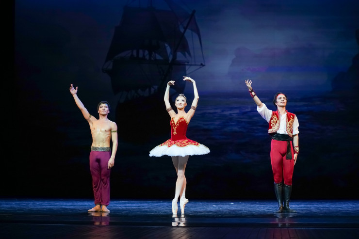 Грандиозным финалом первого отделения стало выступление ведущих солистов трех театров: Фархад Буриев, Бахтияр Адамжан и Жанель Тукеева исполнили трио из балета "Корсар" на музыку Адольфа Адана, сорвав шквал бурных аплодисментов.