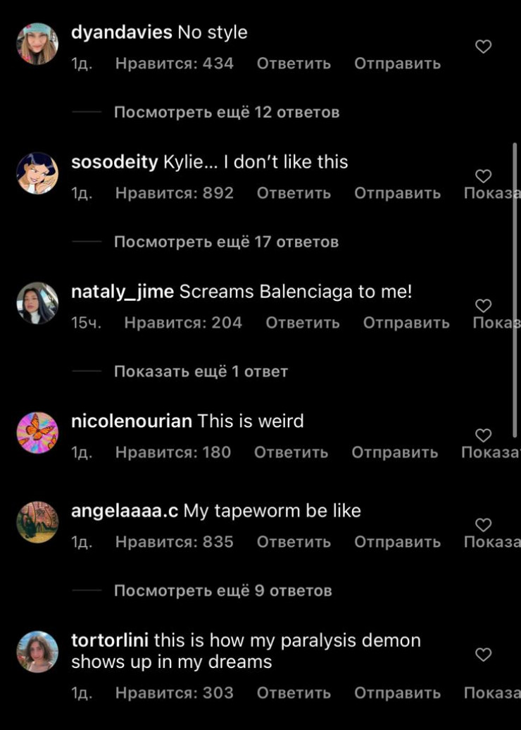 "Берегись, Санта", "Кайли, мне это не нравится", "Где ты находишь такие идеи? Это выглядит нелепо", "Почему вы все думаете, что это платье хорошее?, "Так выглядит демон моего сонного паралича", "Огонь", "Похожа на моего ленточного червя", - пишут комментаторы под постом.