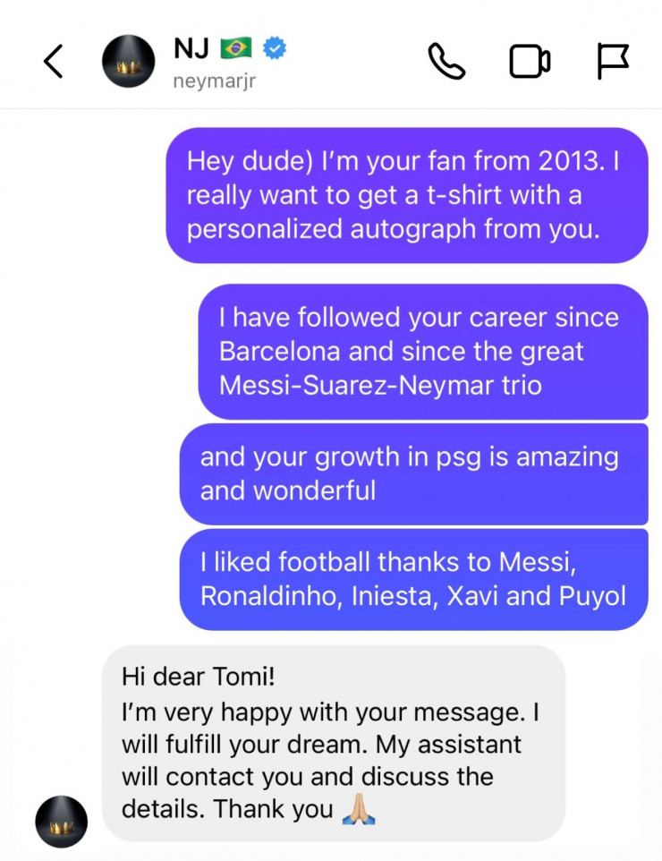 Неймар назвал меня по нику в социальных сетях: "Привет, дорогая Томи! Очень буду рад подарить тебе свою футболку. С тобой свяжется мой ассистент". И он скинул мне Instagram своего ассистента, с которым мы позже списались", - рассказывает Томирис.