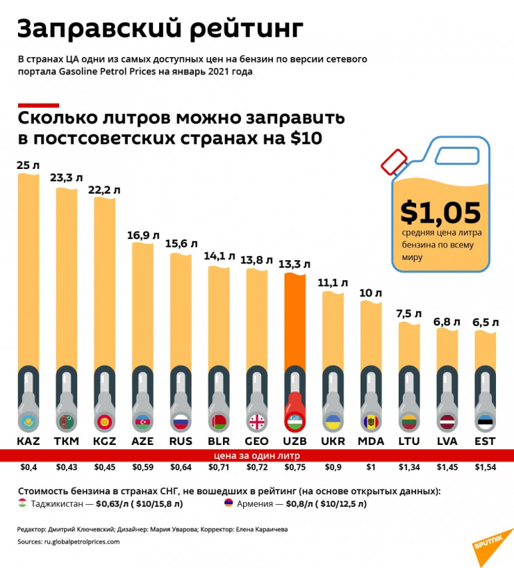 Данные по Таджикистану не представлены. А вот в Узбекистане литр бензина обойдется в 0,75 доллара. Эта разница откинула страну аж на 43-е место рейтинга. На одиннадцать центов дешевле топливо в России - она на 27-м месте.