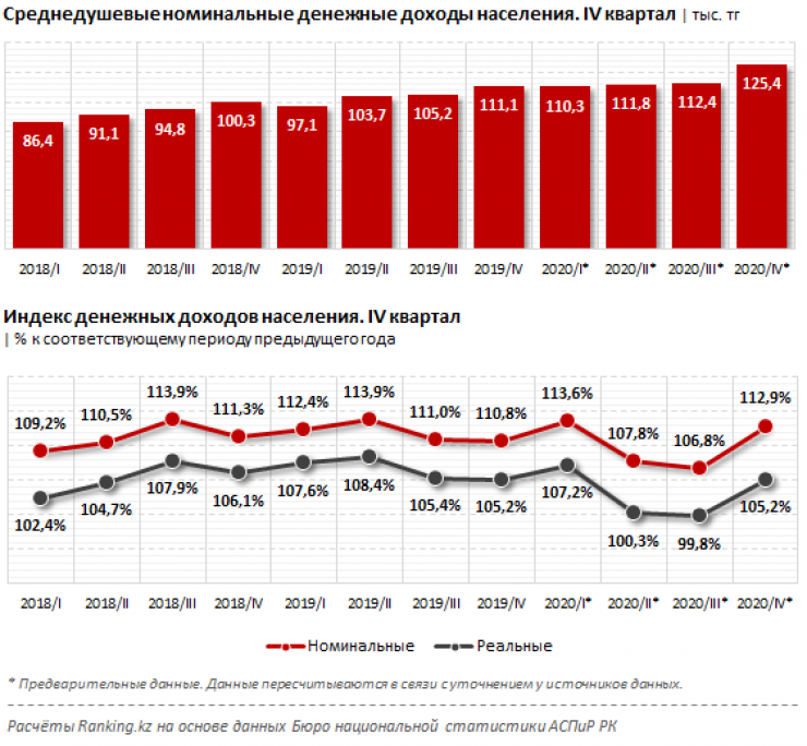 Среднедушевые номинальные денежные доходы населения в четвертом квартале 2020 года составили 125,4 тысячи тенге - на 12,9 процента больше по сравнению с аналогичным периодом 2019-го.