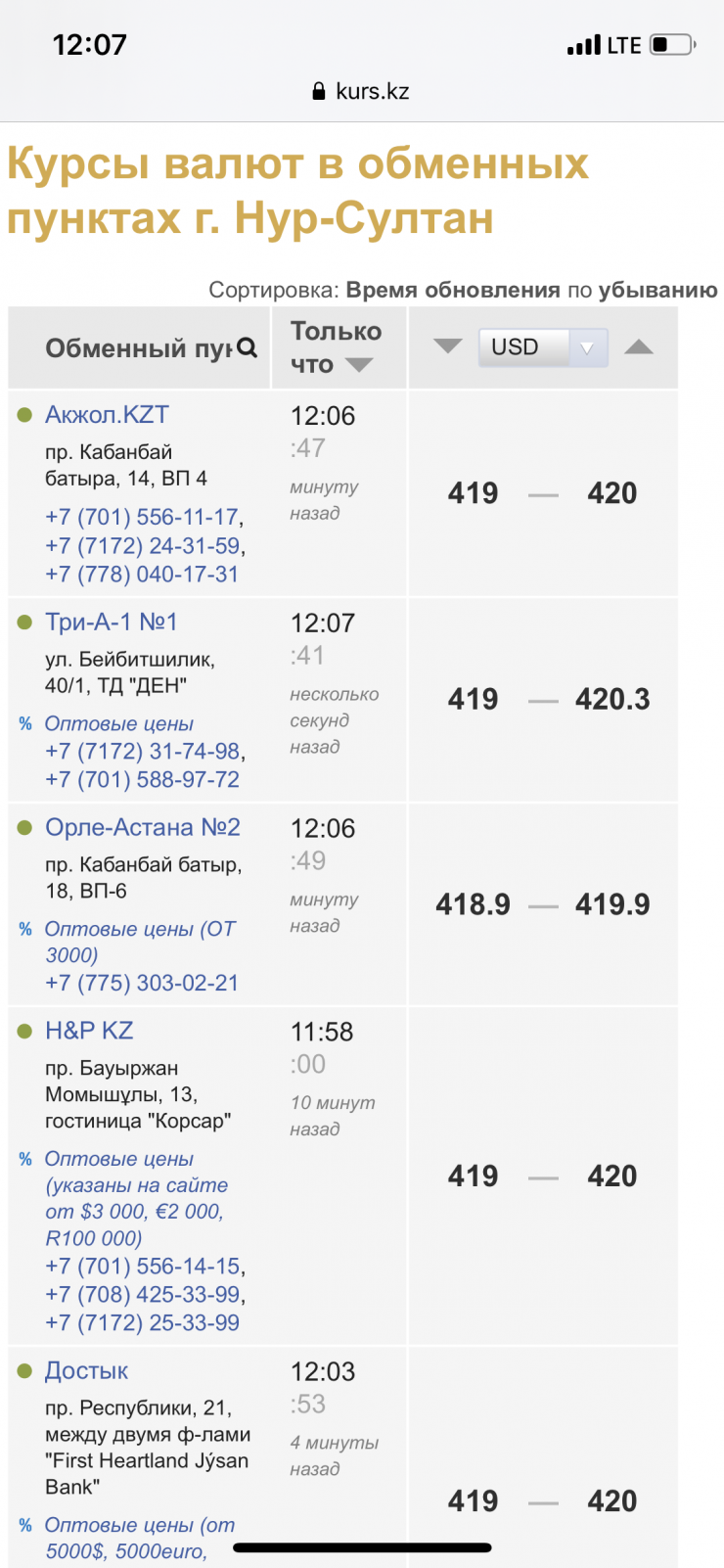По данным kurs.kz, в обменных пунктах Нур-Султана максимальный курс продажи американской валюты на 12.00 составляет 420 тенге, в Алматы - 421 тенге.