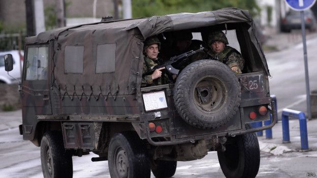 8 полицейских и 14 террористов убиты в городе в Македонии Спецназ на улице в Куманово. © Getty Images
