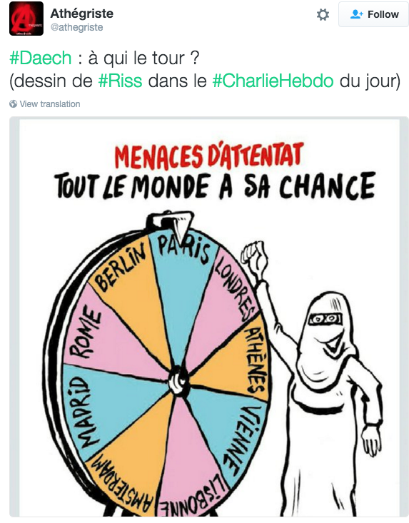 Отметим, что незадолго до взрывов в Брюсселе Charlie Hebdo опубликовал "пророческую" карикатуру. На рисунке было изображено "колесо Фортуны", на котором написаны названия европейских столиц. Стрелка замерла на секторе "Париж", однако женщина на картинке уже готовится повернуть барабан. Следующие сектора: Лондон, Афины, Вена, Лиссабон, Амстердам, Мадрид, Рим и Берлин. Подпись под карикатурой гласит: "Угроза теракта: шанс есть у всего мира".