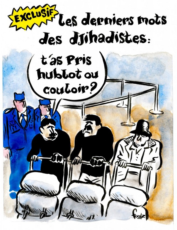 Первое изображение повторяет кадр с записи камер наблюдения, на котором были засняты трое подозреваемых во взрывах. На рисунке мужчины везут тележки с вещами в аэропорту, картинку сопровождает подпись:  "Последние слова террористов: "Ты у окна или у прохода?".