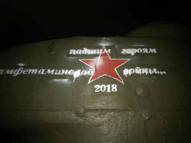 Женщина написала на своей странице в Facebook, что на танке появились надписи, чествующие "падших" героев "амфетаминовой войны".