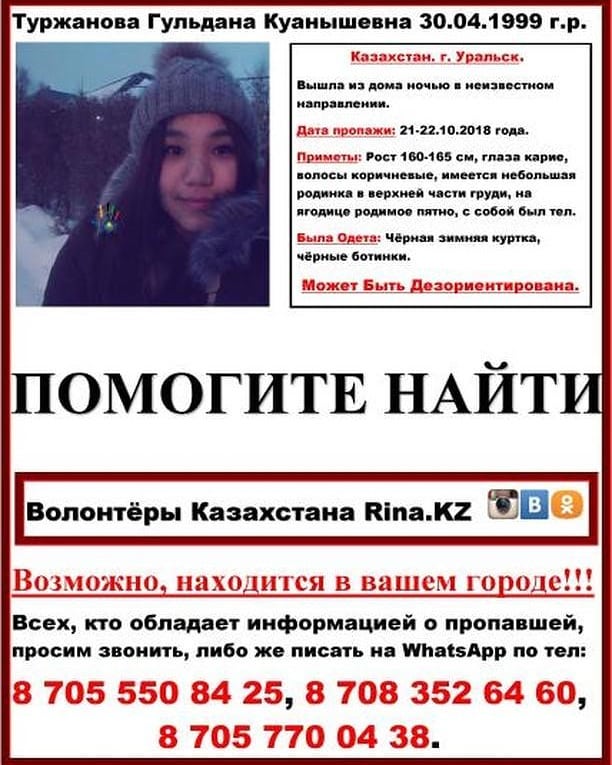 В Уральске родные и полиция 18-й день ищут 19-летнюю студентку Гульдану Туржанову. Девушка ушла из дома 21 октября в неизвестном направлении, не взяв из дома ни денег, ни личных вещей. Об этом сообщает "Уральская неделя".