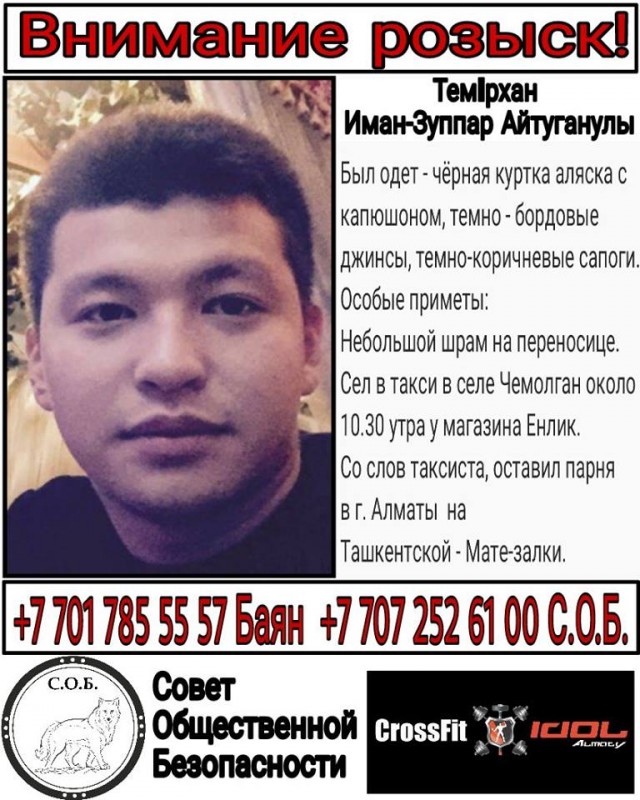 В селе Шамалган Карасайского района Алматинской области пропал Темирхан Иман-Зуппар Айтуганулы 1994 года рождения. 6 февраля 2018 года около 10.30 утра молодой человек сел в такси возле магазина "Енлик". По словам таксиста, он оставил парня в Алматы на пересечении улиц Ташкентская и Саина. Судя по записям с камер наблюдения, установленных в этом районе, он вышел из такси в 11.42 возле магазина "12 месяцев" и направился на АЗС Ros Petrol. Из АЗС он вышел в 11.45 и ушел в неизвестном направлении.