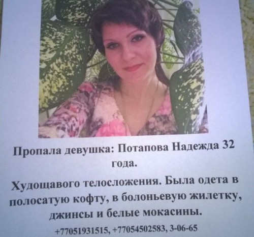 Потапова занимается бизнесом и работает в интернате педагогом. В последний раз женщину видели в районе заправки "Бахыт" 26 сентября в 20.30 вечера. По словам знакомого, подвозившего в тот вечер Надежду домой, у нее зазвонил телефон и она неожиданно попросила оставить ее именно на этом участке дороги. Сказала, что сейчас ее заберут. Знакомый предложил ей подождать ее, но она ответила: "Езжай". И он уехал.
