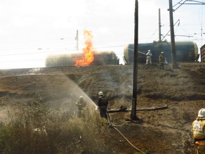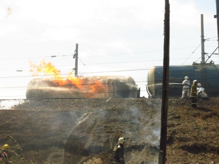 "Сегодня в 12.53 в Шымкенте на железнодорожной станции "Коргасын" произошло опрокидывание одной цистерны с ГСМ (емкость 60 тонн) грузового состава сообщением станция Бейнеу - станция Асса с последующим возгоранием. Рядом находилась еще одна цистерна с ГСМ такой же емкости, которую пожарные охлаждали, подавая воду, для предотвращения взрыва. На время работы огнеборцев сотрудниками полиции было эвакуировано 125 жителей из близ расположенных частных жилых домов", - сообщили в комитете.