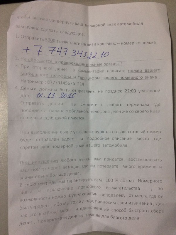 Напомним, в апреле 2014 года студент режиссерского факультета в Алматы попался на вымогательстве денег. Он воровал автомобильные номера и требовал у хозяев перечислить деньги за возврат на указанный счет. Сумма варьировалась от четырех до пяти тысяч тенге. Записки с требованиями, адресованные потерпевшим, студент заканчивал фразой: "Если вы хотите узнать обо мне, то подождите полгода, и я отправлю видеоотчет обо мне!!!" А в марте 2015-го серия аналогичных преступлений произошла в Уральске.