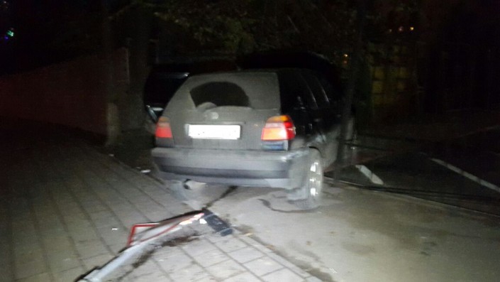 Инцидент произошел по проспекту Райымбека на восток, не доезжая улицы Саина. Со слов очевидцев, водитель авто марки Volkswagen Golf не справился с управлением, автомобиль снес знак, перелетел через арык и врезался в забор.