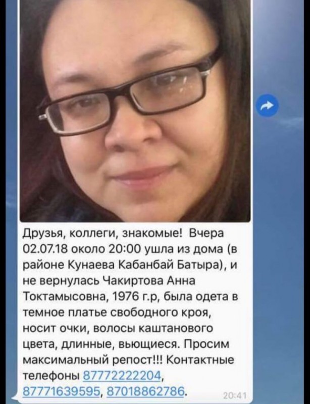 Он добавил, что на видеозаписи с камер наблюдения из аптеки видно, в какой одежде она была в последний раз. По словам Нугманова, она вышла из дома в этой же одежде. Родные Анны Чакиртовой просят всех, кто владеет какой-либой информацией, связаться по телефону: +7 707 272 0945.