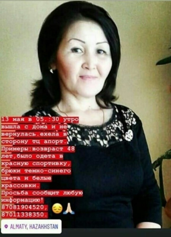 Жоғалған әйел үстіне қызыл түсті күрте, қою көк шалбар және кроссовка киген. Қандай да бір мәлімет білетіндерден туысқандары +7 708 190 45 20, +7 701 133 83 50 нөмірлеріне хабарласуды немесе полицияға қоңырау шалуды сұрап отыр.