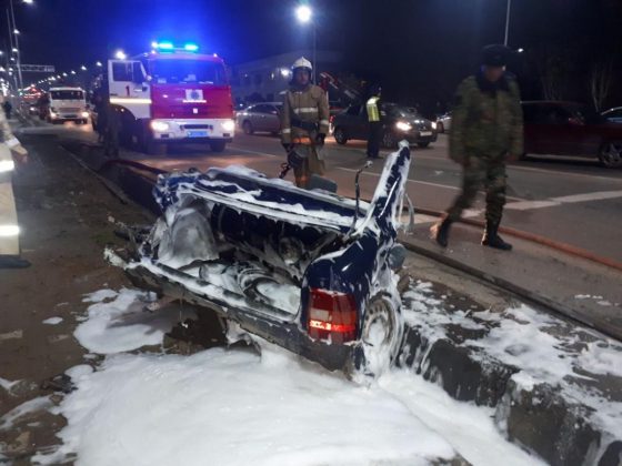 Авария произошла поздним вечером 14 марта. Opel и ВМW столкнулись на перекрестке. При этом удар был такой силы, что одну из иномарок разорвало на две части.