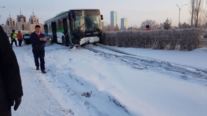 Автобус и Chevrolet вылетели на тротуар после столкновения в Астане: есть пострадавший
