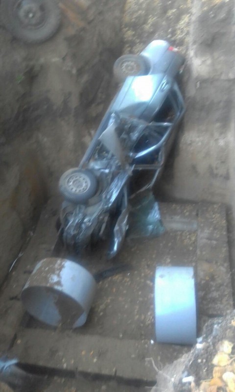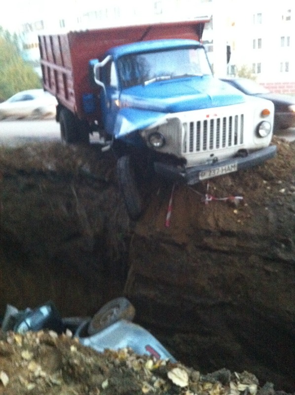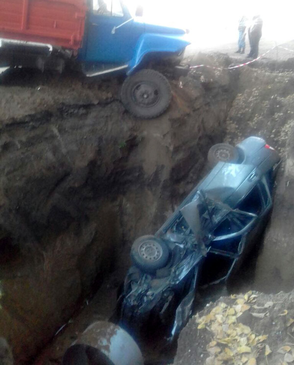 На фото, которые опубликовали очевидцы в соцсетях, видно, что "ГАЗ-53" стоит на краю траншеи с вывернутым колесом. Также у него повреждена передняя часть кузова. Легковой автомобиль оказался на боку весь искореженный. Ее доставили из ямы с помощью крана.
